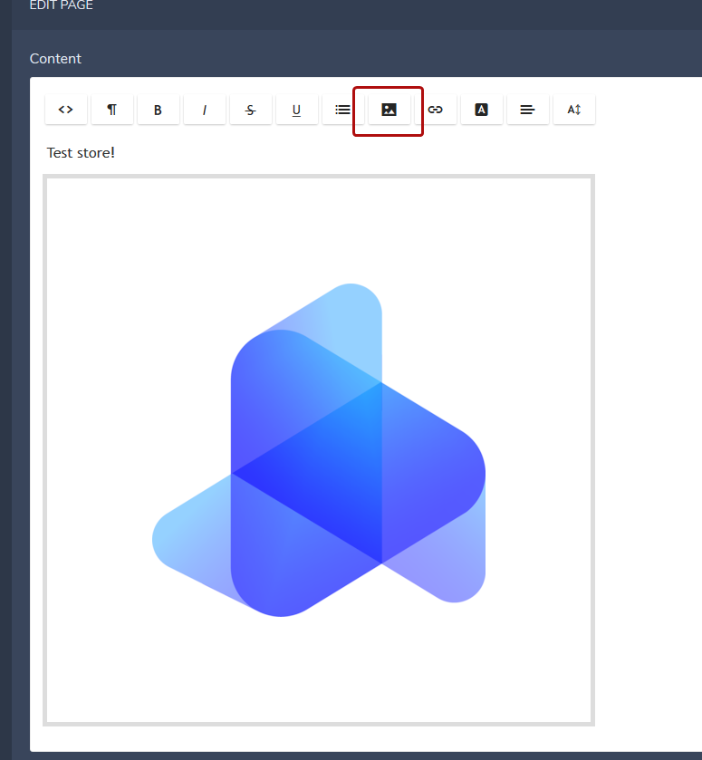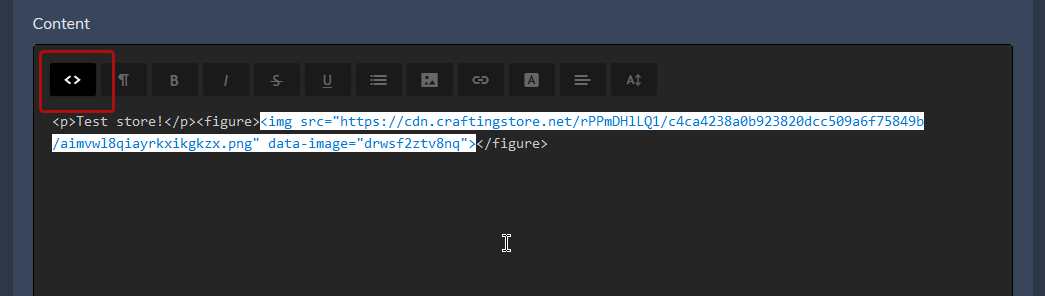 2. Now open the HTML view (the first icon (<>)) and find the image that you've just created. You'll have one for every image. If you have lots of text, it might be hard to find. We've selected it to show how it looks.