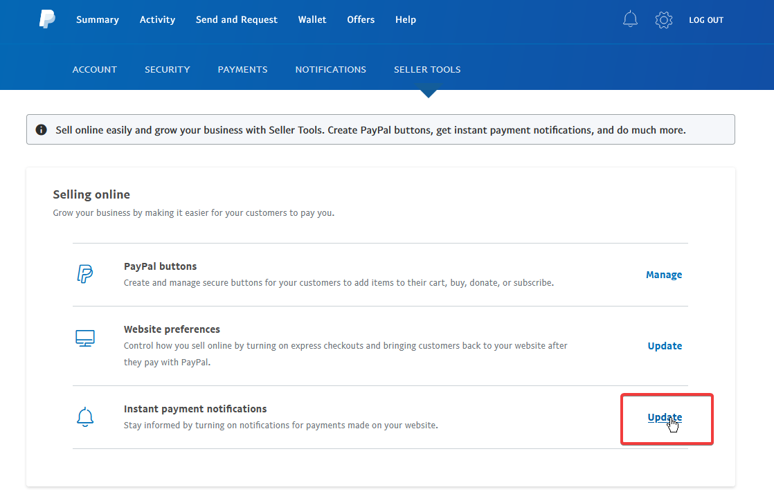 3. Click "update" behind "Instant payment notifications"#
