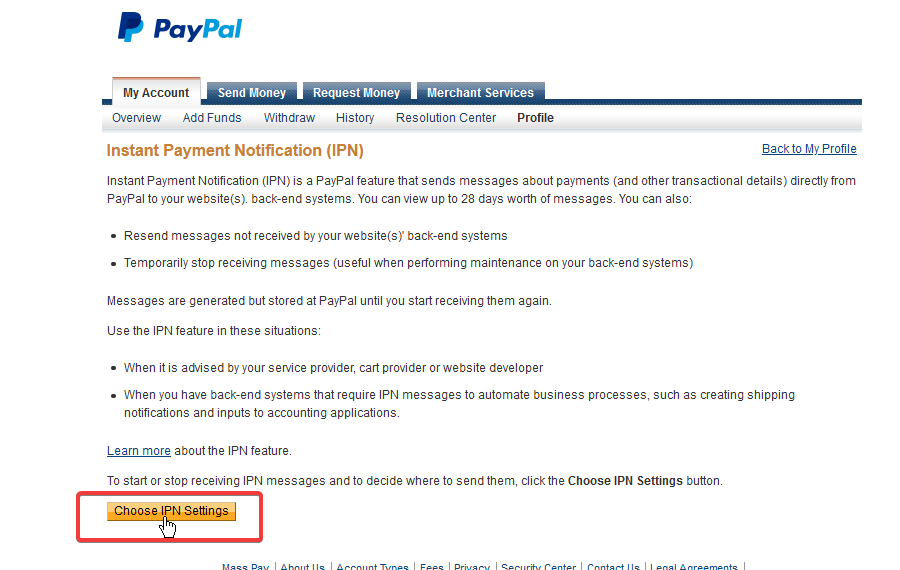 4. You will see the old interface now (PayPal does not yet have this in their new one for our account). Click the "choose IPN settings" option.#