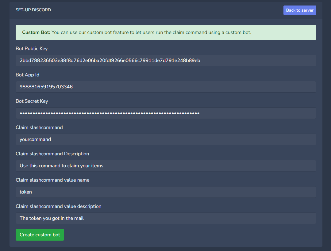 Now it's time to provide us with the information to manage your bot. Go to the server that you created on our dashboard and click "set-up". Then choose "Custom Bot", and enter the information. You can find all the required keys on the Discord developers dashboard.