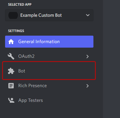 Besides the application, your application also needs a bot, click "Bot" in the sidebar and then "Add bot" at the right top.