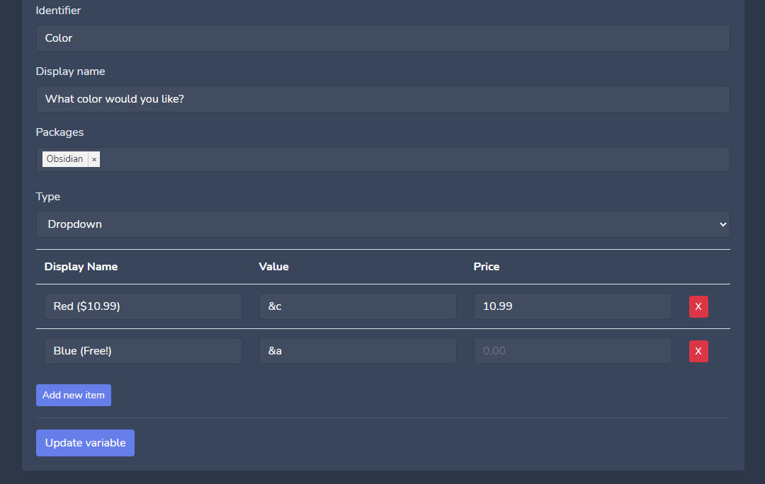 Dropdown: You pre-define selectable items that the user can choose between. You can also charge an extra fee for a specific option.